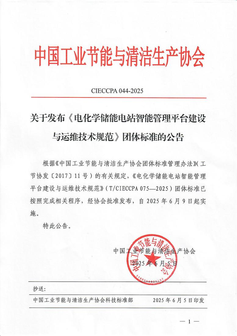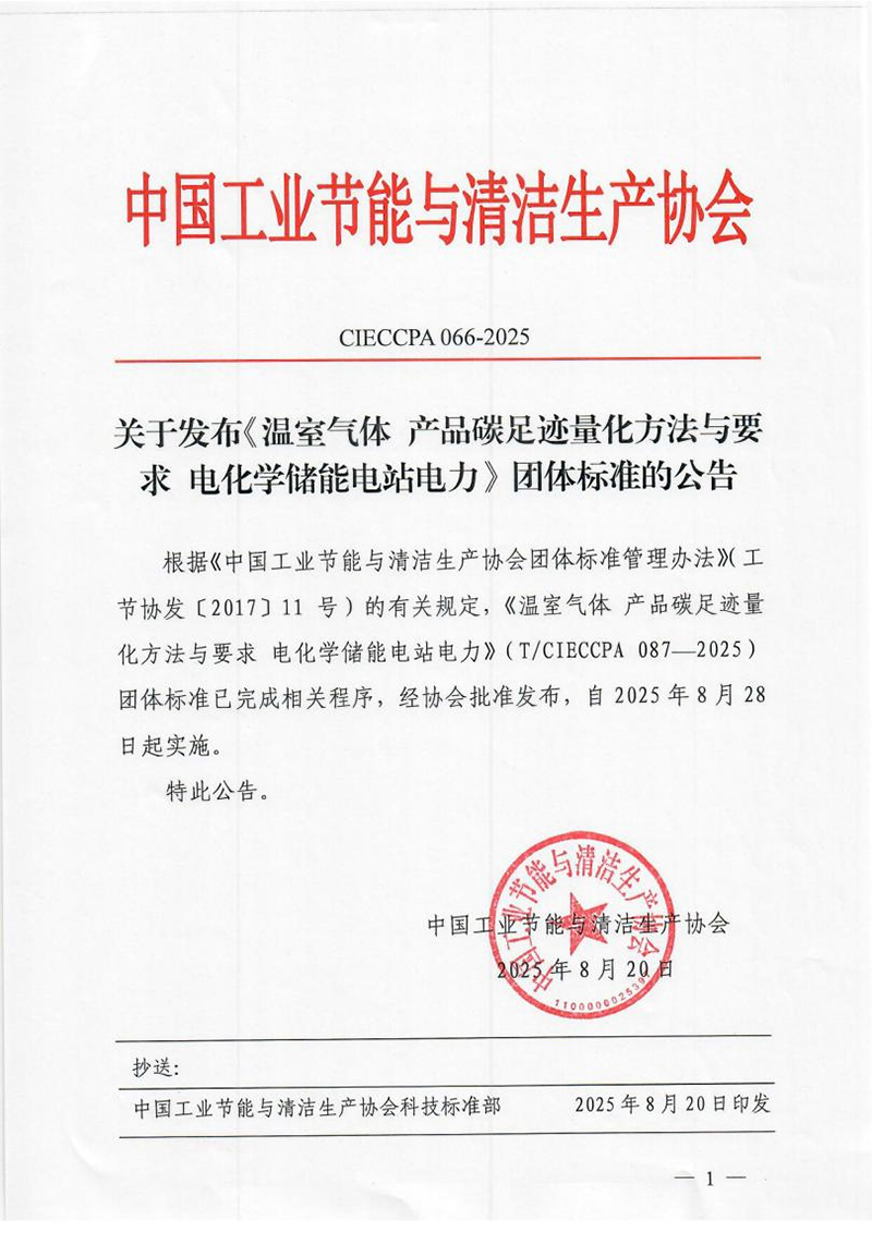 近日,由浙江省環保集團寧波環新能源有限公司牽頭,聯合寧波鋼鐵有限公司、浙江省環保集團生態環保研究院有限公司等單位共同起草的《電化學儲能電站智能管理平臺建設與運維技術規范》(T/CIECCPA 075-2025)與《溫室氣體 產品碳足跡量化方法與要求 電化學儲能電站電力》(T/CIECCPA 087-2025)兩項團體標準,已由中國工業節能與清潔生產協會正式發布,并分別于2025年6月9日、8月28日起實施。該兩項標準的出臺,有效填補了電化學儲能領域在智能化管理與碳足跡量化方面的關鍵技術空白。